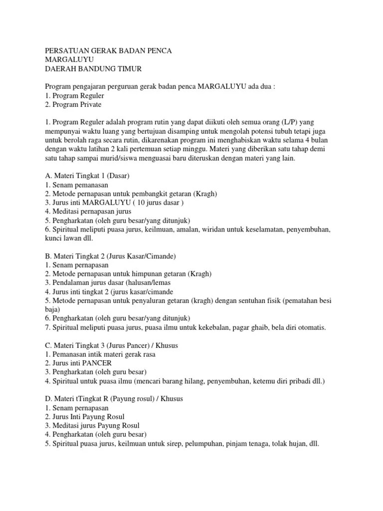 Program pengajaran perguruan gerak badan penca margaluyu ada dua :